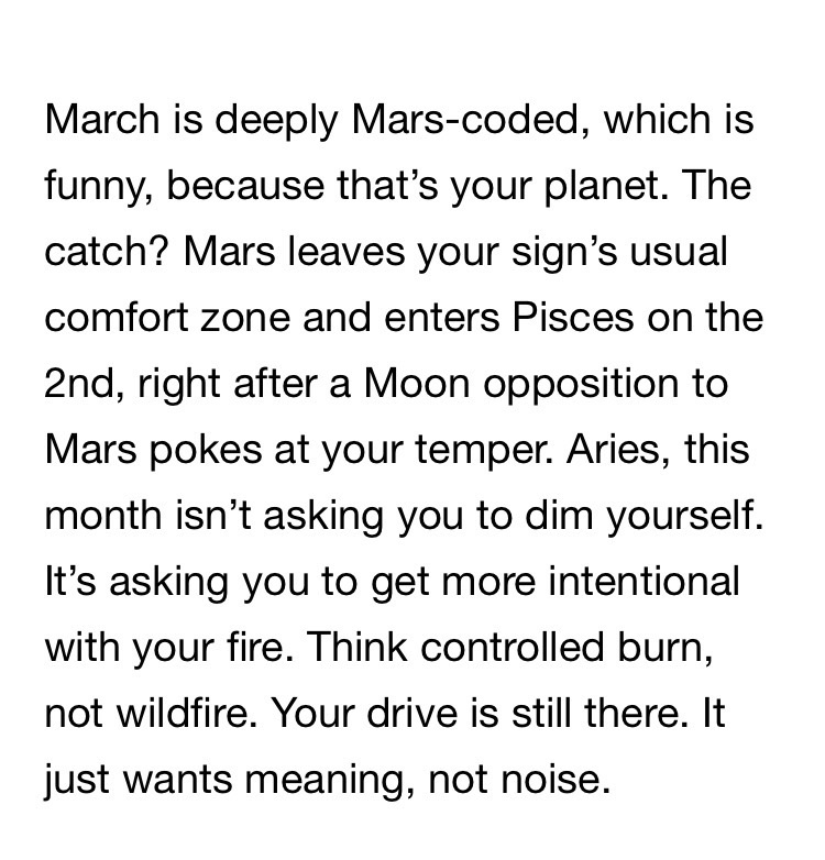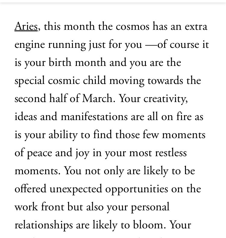 To tried to mix it up this month. I Googled Aries monthly horoscope and picked two different sites from the norm to sample for the horoscope part…